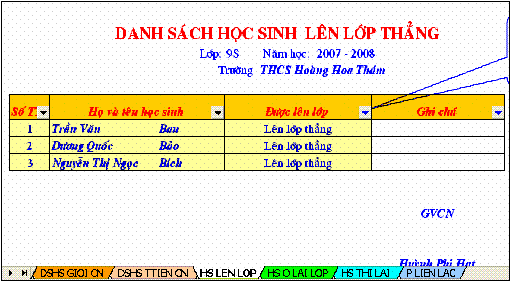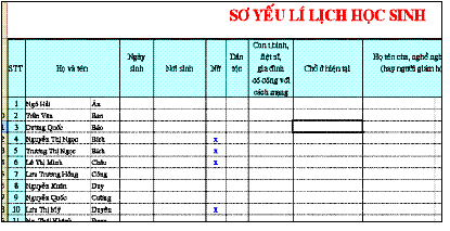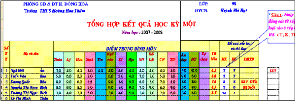 Đây là bộ chương trình quản lý điểm và xếp loại thi đua cho học sinh bậc THCS.Bộ chương trình này gồm có : SỔ ĐIỂM CÁ NHÂN (3 loại: 5 LỚP, 10 LỚP & 15 LỚP) và BIỂU TỔNG HỢP KẾT QUẢ & XẾP LOẠI THI ĐUA HỌC SINH THCS ( dành cho giáo viên chủ nhiệm giống như Sổ gọi tên & ghi điểm nhưng có đầy đủ các danh sách liên quan). Các chương trình rất dễ sử dụng và có báo lỗi khi ta nhập sai. Những chương trình này đã được áp dụng rộng rãi ở Phú Yên và được Sở công nghệ khoa học tỉnh Phú Yên hỗ trợ kinh phí để thực hiện chương trình quản lý điểm cho toàn trường THCS.A. SỔ ĐIỂM CÁ NHÂN1.Ưu điểm của chương trình- Rất dễ dàng sử dụng vì chúng giống hoàn toàn Sổ điểm cá nhân hiện nay các giáo viên chúng ta đang sử dụng trên lớp.- Sử dụng độc lập và tạo Password (nếu cần thiết) tránh sửa chữa từ người khác.- Chương trình phát hiện lỗi sai khi ta nhập không đúng, hoặc không cho nhập vào các ô lập trình.- Ta có quyền xoá và nhập lại mà không ảnh hưởng gì đến chương trình.- Sao chép và sử dụng nhiều năm, nhiều giáo viên.- Không phụ thuộc vào số cột điểm và điểm lẻ, sử dụng chung cho tất cả các giáo viên bộ môn, áp dụng cho tất cả các khối lớp .- Giáo viên dạy nhiều môn, nhiều lớp vẫn sử dụng chung 1 Sổ điểm- Đặc biệt Chương trình thực hiện các thống kê như: CHẤT LƯỢNG (HKI, HKII,CẢ NĂM) và THỐNG KÊ ĐIỂM BÀI THI ( HKI,HKII) có cả số NỮ.2. Giới thiệu tổng quát- TRANG BÌA: Nhập một số thông tin liên quan ( tên giáo viên , lớp và môn học) mà mình phụ trách. Nhấp chuột vào các biểu tượng thống kê để xem kết quả.- H. DẪN SỬ DỤNG: Đây là trang hướng dẫn cụ thể khi ta gặp rắc rối hãy xem trang này.- LOP A, LOP B, LOP C…: Đây là những trang tương ứng với trang sổ điểm cá nhân, mỗi Sheet là một môn học trên lớp.- THỐNG KÊ KẾT QUẢ BÀI THI : Đây là trang thống kê kết quả bài thi theo học kì có số nữ kèm theo.- CL-HKI, CL-HKII và CL-CANAM: Đây là những trang thống kê chất lượng bộ môn theo học kì và cả năm có cả số nữ.3. Cách sử dụng:a. Nhập một số thông tin liên quan ( tên giáo viên , lớp và môn học) mà mình phụ trách. Chỉ nhập những Ô màu trắng.b. Nhập tên học sinh và điểm : Ta chỉ cần nhấp chuột vào chữ LỚP mà mình muốn nhập dữ liệu của lớp đó ở TRANG BÌA thì chương trình sẽ chuyển sang.* Chú ý:- Nhập họ và tên học sinh theo mẫu để danh sách học sinh đẹp.- Phải đánh dấu “x” vào ô Nữ để chương trình thống kê.- Nhập điểm theo quy định của Bộ giáo dục. Các cột điểm không nhất thiết phải bằng nhau- Học sinh không có điểm học kì chương trình sẽ không thực hiện.- Nếu nhập sai quy định thì chương trình sẽ báo lỗic. Các danh sách thống kê: Chúng ta không nhập bất cứ dữ liệu nào vì chương trình đã thực hiện đầy đủ.d. In ấn: Chúng ta muốn in thông tin nào chỉ việc vào trang đó nhấp vào biểu tượng máy in trên thanh công cụ thì máy sẽ in mà không phải thiết lập trang in.B. BIỂU TỔNG HỢP KẾT QUẢ VÀ XẾP LOẠI THI ĐUA HỌC SINH THCS1.Ưu điểm của chương trình- Sử dụng độc lập và tạo Password (nếu cần thiết) tránh sửa chữa từ người khác.- Rất dễ dàng sử dụng vì chúng giống Sổ điểm chính hiện nay của Bộ giáo dục đang lưu hành.- Chúng ta chỉ sử dụng kết quả TB môn của các môn học theo quy định để nhập thì chương trình sẽ cho ra các danh sách thống kê (DS HỌC SINH GIOI HKI, HKII, CẢ NĂM; DANH SÁCH HỌC SINH TIÊN TIẾN HKI, HKII, CẢ NĂM, DANH SÁCH LÊN LỚP THẲNG ; DANH SÁCH HỌC SINH Ở LẠI LỚP; DANH SÁCH HỌC THI LẠI có môn thi kèm theo ; PHIẾU LIÊN LẠC và CHẤT LƯỢNG HKI, HKII,CẢ NĂM có kèm theo số nữ ).- Chương trình phát hiện lỗi sai khi ta nhập không đúng, hoặc không cho nhập vào các ô lập trình.- Ta có quyền xoá và nhập lại mà không ảnh hưởng gì đến chương trình.- Sao chép và sử dụng nhiều năm, nhiều giáo viên.2. Giới thiệu tổng quát- TRANG BÌA: Nhập một số thông tin liên quan ( tên giáo viên , lớp) mà mình phụ trách. Nhấp chuột vào các biểu tượng thống kê để xem kết quả.- H. DẪN SỬ DỤNG: Đây là Sheet hướng dẫn cụ thể khi ta gặp rắc rối hãy xem trang này.- SƠ YẾU LÍ LỊCH: Đây là trang tương ứng với trang Sơ yếu lí lịch trong Sổ điểm gọi tên ghi điểm.- XẾP LOẠI HKI, HKII: Đây là những trang nhập điểm TB các môn.- XẾP LOẠI CẢ NĂM , XẾP LOẠI THI ĐUA: Đây là những trang cho ra kết quả thi đua cả năm.- T.KE CL-HKI, CL-HKII và CL-CA NAM: Đây là những trang thống kê chất lượng học lực và hạnh kiểm theo học kì và cả năm có cả số nữ.- DS HỌC SINH GIỎI, TIÊN TIÊN, LÊN LỚP, Ở LẠI LỚP, THI LẠI và PHIẾU LIÊN LẠC: Đây là những trang thống kê từ kết quả nhập vào ở XẾP LOẠI HKI, HKII.3. Cách sử dụng:a. Nhập một số thông tin liên quan ( tên giáo viên , lớp) mà mình phụ trách. Chỉ nhập những Ô màu trắng giống như Sổ điểm cá nhân.b. Nhập tên học sinh: Ta chỉ nhập danh sách học sinh vào trang Sơ yếu