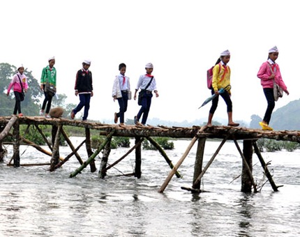 Sách vở rơi xuống sông ướt nhèm, lấm lem bùn đất là chuyện thường. Ông Đặng Ngọc Dũng, Chủ tịch UBND huyện Sơn Hà xót xa, do địa hình cách trở nên nhiều năm qua đường đến trường của hàng trăm học sinh ở xã Sơn Ba còn quá gian nan vất vả. Mùa mưa thì "đu dây" kéo bè đến trường, mùa nắng thì tìm địa điểm nào cạn nhất để vượt sông (do gia đình nghèo nên không thể trang trải tiền nộp phí) qua những chiếc cầu tre do người dân tự làm.